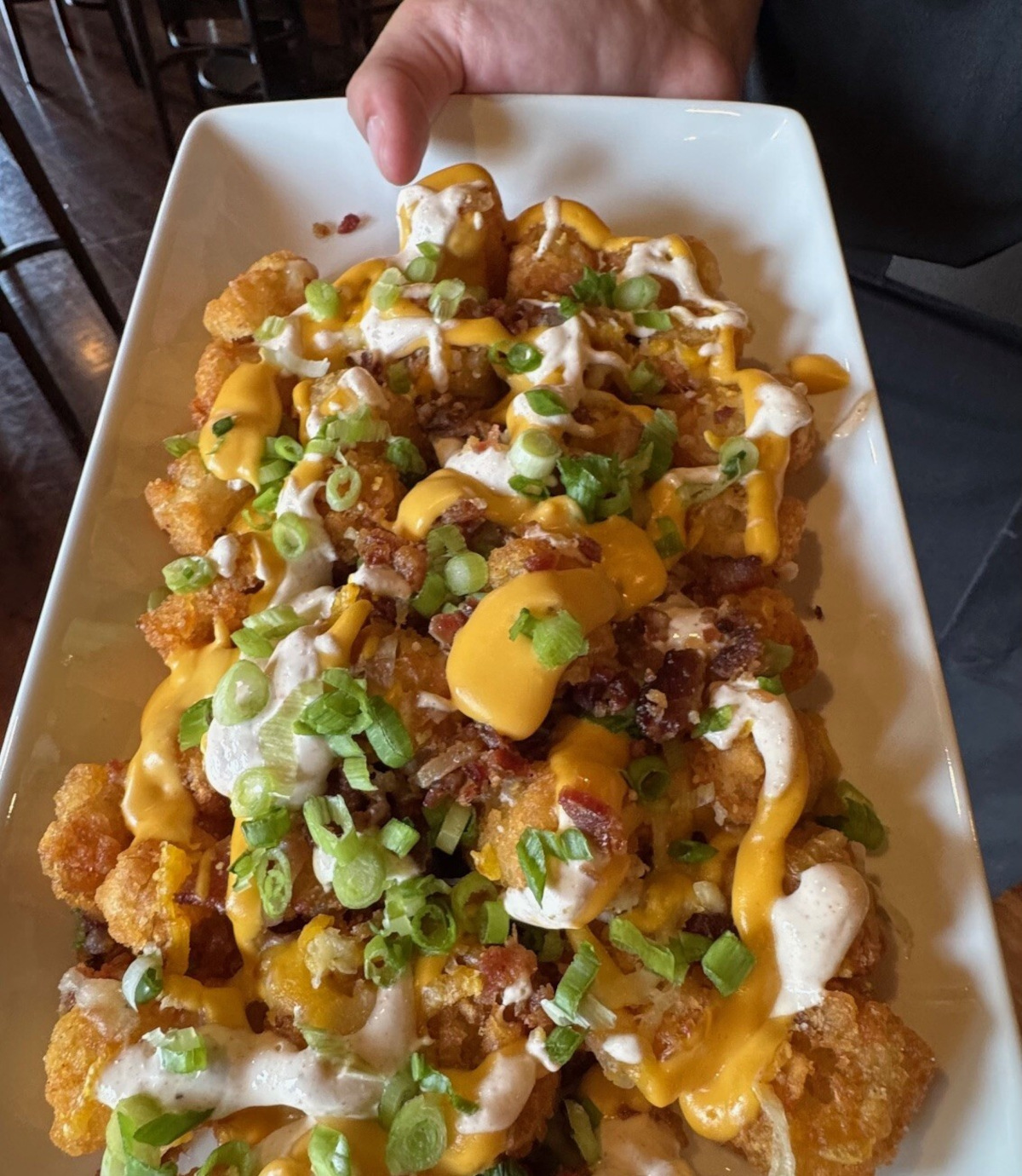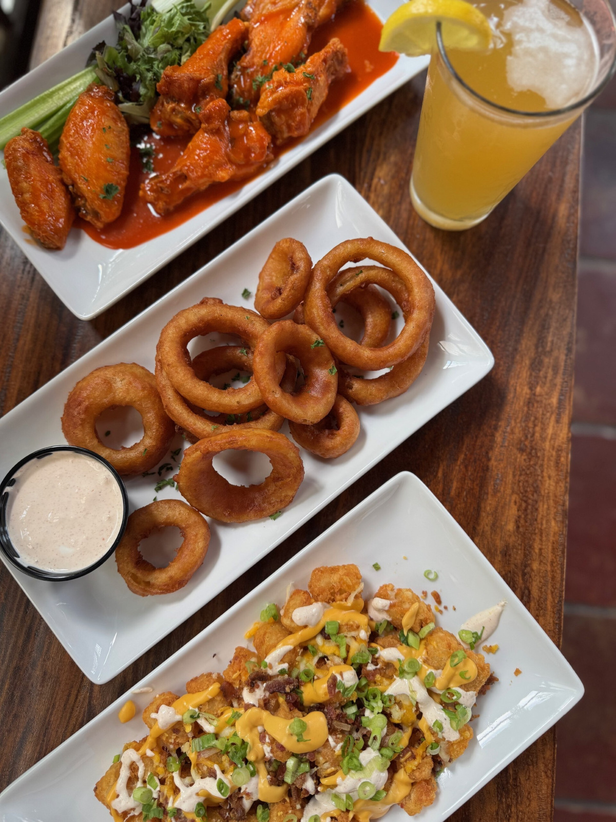Onion Rings, Pretzel Sticks, Loaded Tots, Carnitas Nachos, Wings, Tuna Tostadas, Spinach Artichoke Dip